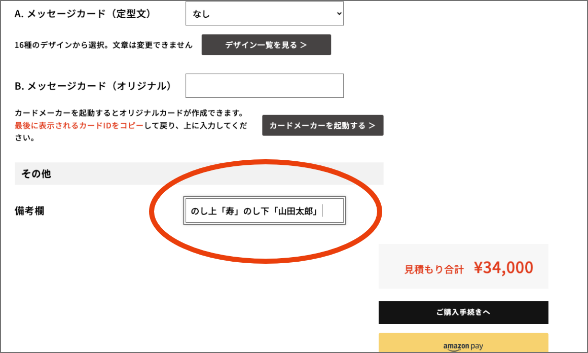 のし紙の上部、下部の二箇所に印字可能です。カートの最後に表示される【備考欄】に印字内容を記入してください