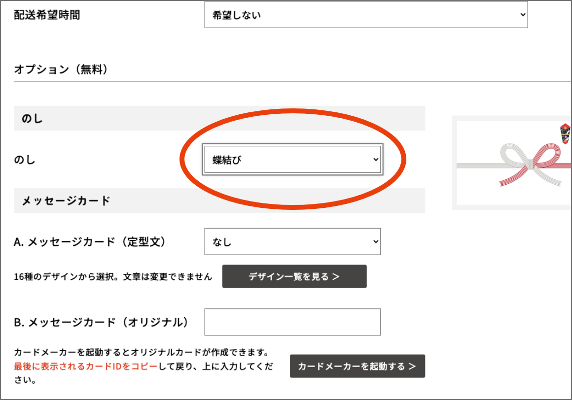 カートに入れた後、オプションでのし紙の種類を選択できます。